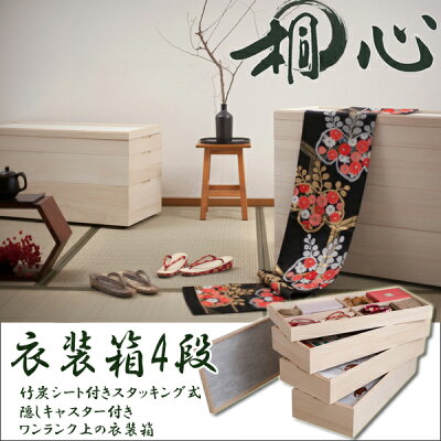 【桐心】きごころシリーズ 隠しキャスター付きスタッキング式桐衣装箱4段 高級桐ケース桐衣装箱 桐の衣装ケース チェスト 押入れ クローゼット 和ダンス 和タンス 和箪笥 着物 日本製 引き出し 着物収納 桐たんす 収納ケース 押し入れ 着物入れ 整理タンス 衣装タンス